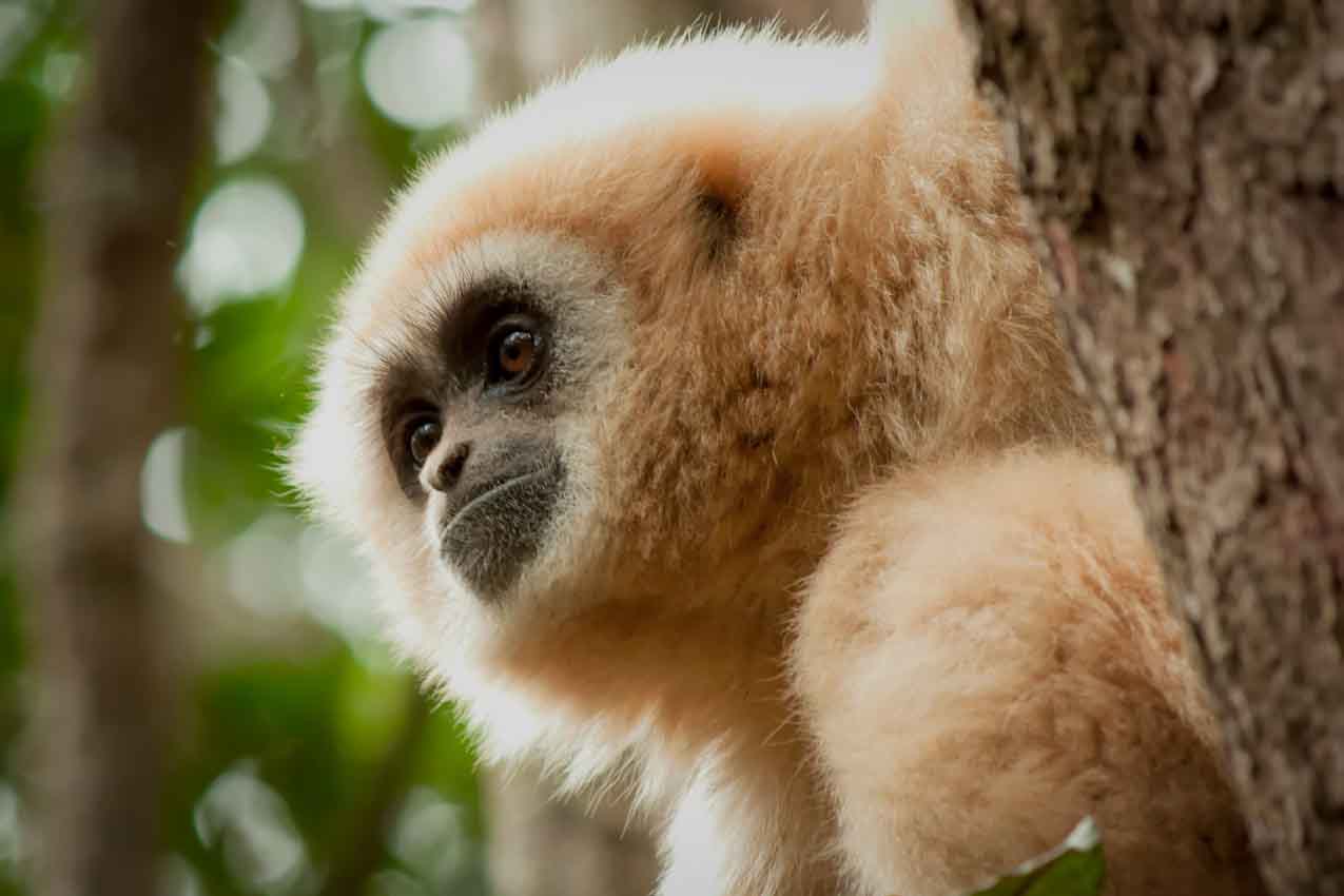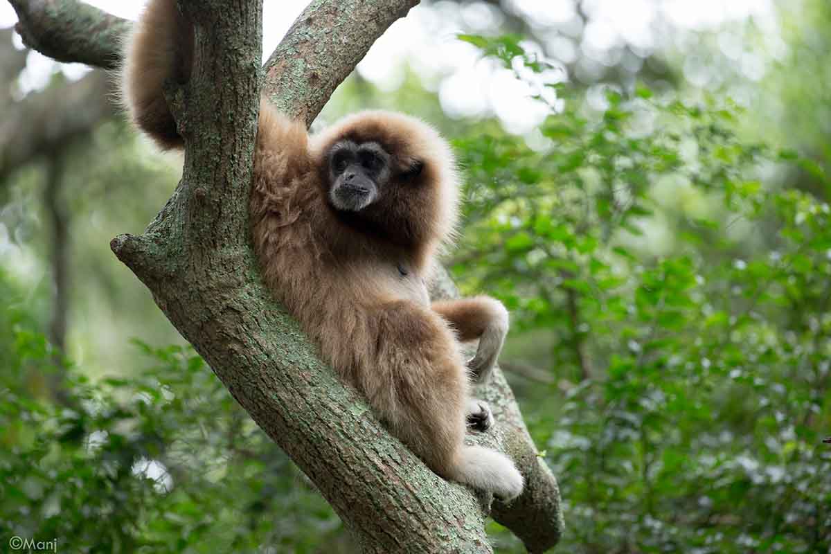 I am so fast that I barely touch a branch before swinging off and grabbing the next branch, I can “fly” up 40 feet through the air and leap long distances before landing. Did you know that apes and lesser apes have no tails? I am a lesser ape, all gibbon species are lesser apes. Despite having no tail, I have an acute sense of balance.
